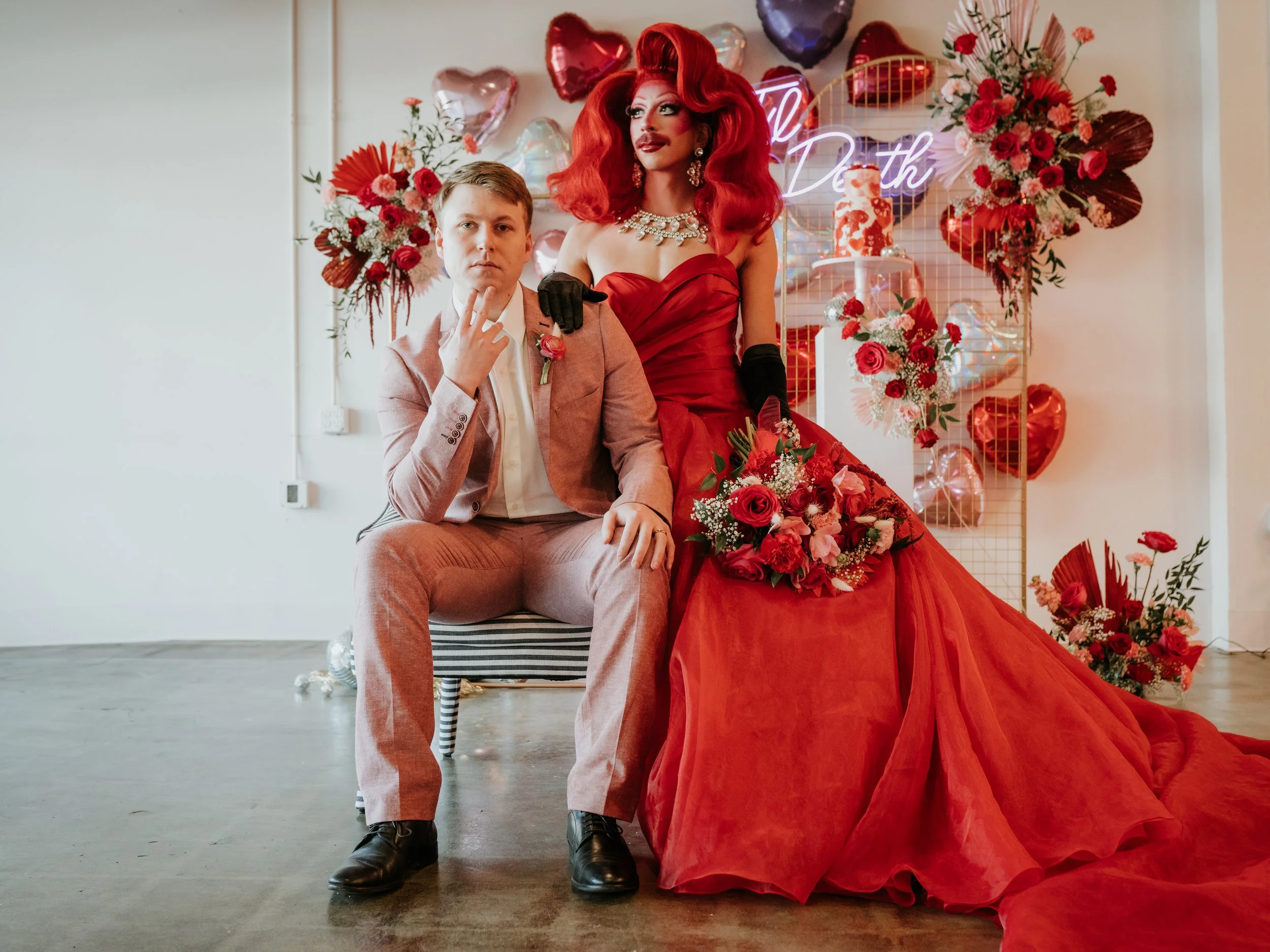So, you are looking at a styled shoot spread in your favorite bridal magazine or Instagram, your next question is definitely “how do I take what I see and love, and make it possible at my event”? This one is a little more nuanced. A lot of styled shoots are HUGE! These shoots of over-the-top details, and vibrant color pallets - just like our current Disco Drag shoot! That may have you wondering, how do you take these ideas and make them useable for my event? That all depends on you. With this shoot, I would look at the colors. Too many events stick to neutral tones, with this idea of “timelessness.” But that isn’t a rule friend! You can be bold AF. Who cares if you look back at photos and say, “Wow, that screams, 2022!“ It is, in fact 2022, document the true you, in the now! Play with color. Another thing you can take from this: wedding dresses don’t have to be white. There is an entire color wheel out there to play with. Red, blue, purple, orange, black, pink…just saying!